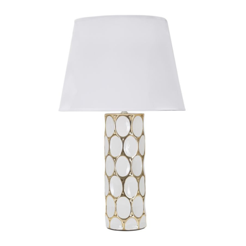 Asztali lámpa fehér és arany kerámiából, domborműben elegáns geometrikus díszítéssel. Komplett fehér szövet lámpabúrával. Asztali lámpa fehér és arany kerámiából, domborműben elegáns geometrikus díszítéssel. Komplett fehér szövet lámpabúrával.