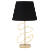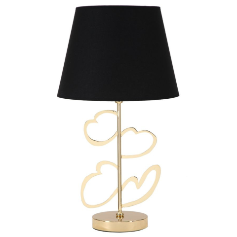 Asztali lámpa aranyozott fémből és fekete szövet lámpaernyőből hipnotikus kialakítással. A glam stílus az elegáns és extravagáns részleteket ötvözi. Asztali és állólámpák, amelyek kitűnnek az arany és a sötét színek, például a fekete kombinációjával. A