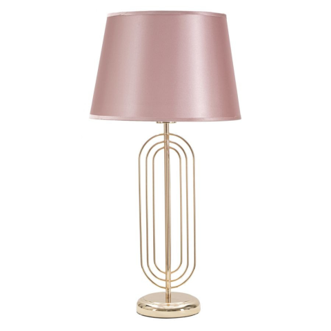 Elegáns, glam stílusú asztali lámpa arany fémből és lámpabúra rózsaszín anyagból. A fémes díszítések geometrikus és letisztult vonalakkal minden bútortípust előkelő stílust kölcsönöznek. Elegáns, glam stílusú asztali lámpa arany fémből és lámpabúra róz