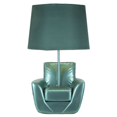 A 70-es évek ihlette, fotel alakú türkiz gyanta asztali lámpa. Türkiz szövet lámpaernyővel kiegészítve. A 70-es évek ihlette, fotel alakú türkiz gyanta asztali lámpa. Türkiz szövet lámpaernyővel kiegészítve.