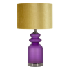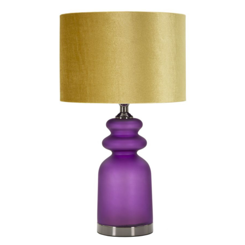 Bájos lámpa lila üvegtalppal és arany bársony lámpaernyővel: az elegancia és a titokzatosság keveredik a fények és árnyékok hangulatos és meleg játékában. Bájos lámpa lila üvegtalppal és arany bársony lámpaernyővel: az elegancia és a titokzatosság keve