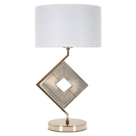 Arany fém asztali lámpa elegáns geometrikus díszítéssel kiegészítve fehér szövet lámpabúrával, arany széllel. Arany fém asztali lámpa elegáns geometrikus díszítéssel kiegészítve fehér szövet lámpabúrával, arany széllel.
