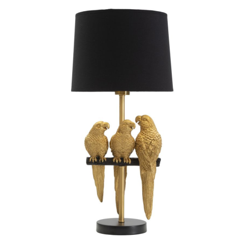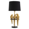 Arany fém asztali lámpa fekete szövet lámpabúrával. A szárat papagájok díszítik. Az arany és a fekete egyesülése tökéletes kontrasztot hoz létre, amely bármilyen helyiségbe illeszkedik. Arany fém asztali lámpa fekete szövet lámpabúrával. A szárat papag