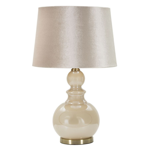 Asztali lámpa krémszínű üvegből készült talppal és krémbársony árnyékolóval, amely tökéletes hangulatos és kényelmes légkört teremt bármely helyiségben. Asztali lámpa krémszínű üvegből készült talppal és krémbársony árnyékolóval, amely tökéletes hangul