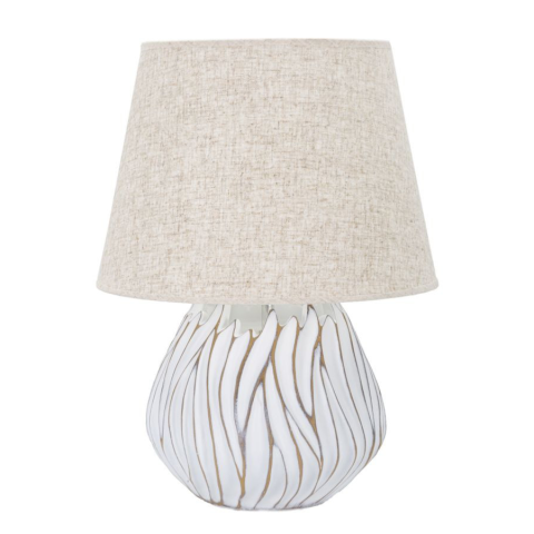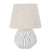 Gyanta asztali lámpa elegáns, domborműves, lineáris díszítéssel. Bézs szövet lámpaernyővel kiegészítve. Gyanta asztali lámpa elegáns, domborműves, lineáris díszítéssel. Bézs szövet lámpaernyővel kiegészítve.