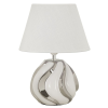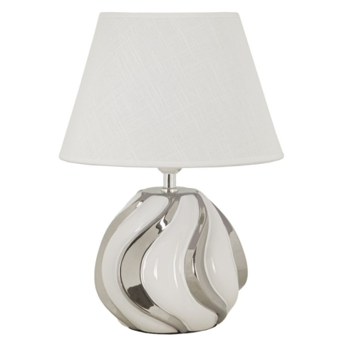 Fehér kerámia lámpa ezüst bevonattal, egyszerű és elegáns dizájnnal. Komplett fehér szövet lámpabúrával. Fehér kerámia lámpa ezüst bevonattal, egyszerű és elegáns dizájnnal. Komplett fehér szövet lámpabúrával.