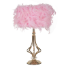 Arany fém asztali lámpa geometrikus kialakítással, elegáns szintetikus tollakkal kiegészített lámpabúrával. Arany fém asztali lámpa geometrikus kialakítással, elegáns szintetikus tollakkal kiegészített lámpabúrával.