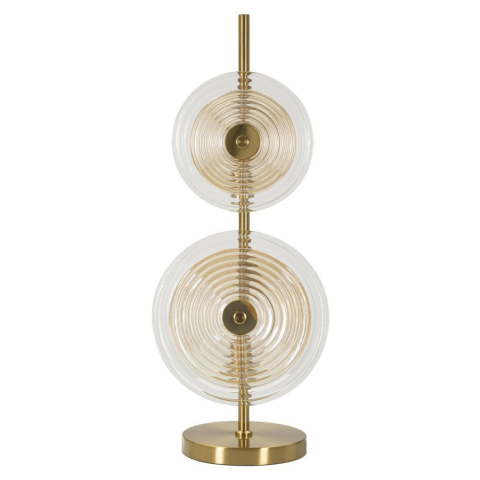 Asztali lámpa 2 fényponttal, arany fémből, egyszerű és lényegre törő vonalakkal, elegáns üveg lámpaernyőkkel, domborműves díszítéssel. Asztali lámpa 2 fényponttal, arany fémből, egyszerű és lényegre törő vonalakkal, elegáns üveg lámpaernyőkkel, domborm