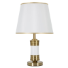 Asztali lámpa arany fémből, elegáns fehér díszítéssel, kerek talppal. Fehér szövet lámpaernyővel, arany szélekkel. Asztali lámpa arany fémből, elegáns fehér díszítéssel, kerek talppal. Fehér szövet lámpaernyővel, arany szélekkel.