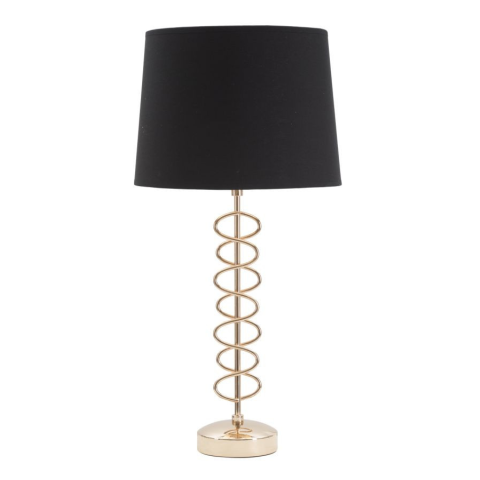 Asztali lámpa arany fémből, fekete szövet lámpaernyővel. Az egyszerű és elegáns alap kidolgozása, valamint a fekete és az arany kontrasztja finomságot kölcsönöz minden helyiségnek. Asztali lámpa arany fémből, fekete szövet lámpaernyővel. Az egyszerű és