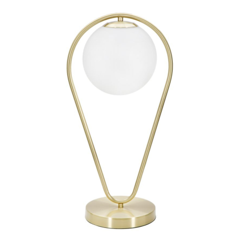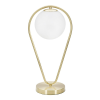 Arany fém asztali lámpa fehér üveggömbbel. A hőlégballonra emlékeztető alapvető vonalakat az arany eleganciájával kombinálva egyedi kombinációt alkotnak. Arany fém asztali lámpa fehér üveggömbbel. A hőlégballonra emlékeztető alapvető vonalakat az arany