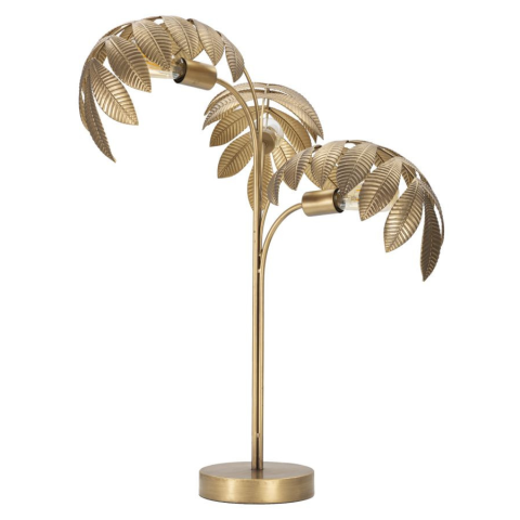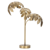 Arany fém asztali lámpa 3 fényponttal, kerek talppal, egzotikus levelek ihlette dizájnnal. Arany fém asztali lámpa 3 fényponttal, kerek talppal, egzotikus levelek ihlette dizájnnal.