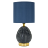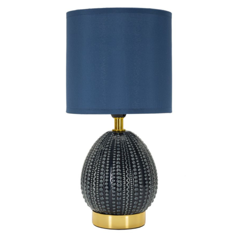 Elegáns éjjeli lámpa kék alappal és szabálytalan domborműves díszítéssel, amely ideális stílust és fényességet kölcsönöz szobájának. Kék szövet árnyékolóval kiegészítve. Elegáns éjjeli lámpa kék alappal és szabálytalan domborműves díszítéssel, amely id