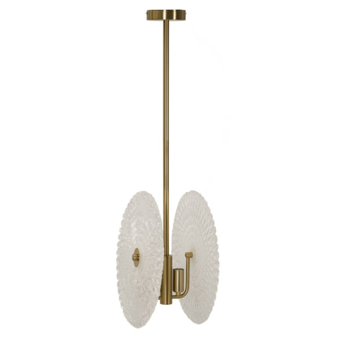 Arany fém mennyezeti lámpa 2 fényponttal, egyszerű és lényegre törő vonalakkal, elegáns üveg lámpaernyőkkel, domborműves díszítéssel. Arany fém mennyezeti lámpa 2 fényponttal, egyszerű és lényegre törő vonalakkal, elegáns üveg lámpaernyőkkel, domborműv