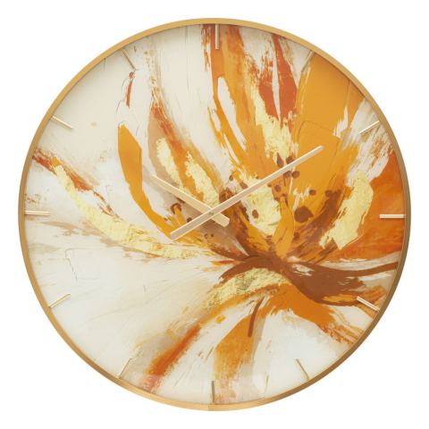 Kerek falióra elegáns arany kerettel és élénk és élénk tónusokkal díszített számlappal. Kerek falióra elegáns arany kerettel és élénk és élénk tónusokkal díszített számlappal.