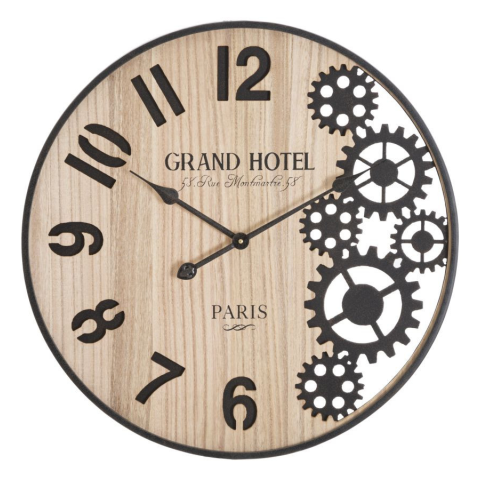 Kerek falióra fogaskerekekkel, amelyek felidézik a mechanikus eszközök belső mechanizmusait. Kerek falióra fogaskerekekkel, amelyek felidézik a mechanikus eszközök belső mechanizmusait.