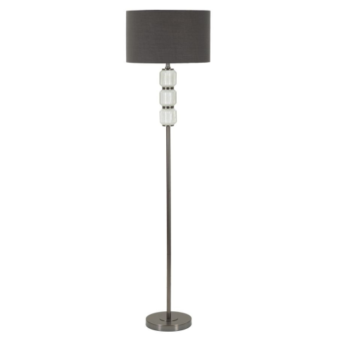 Elegáns állólámpa fehér üvegtalppal és szürke bársony ernyővel modernitást áraszt, tökéletes arra, hogy stílusosan megvilágítsa otthona minden sarkát. Elegáns állólámpa fehér üvegtalppal és szürke bársony ernyővel modernitást áraszt, tökéletes arra, ho