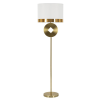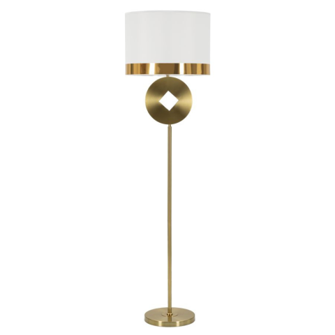 Arany fém állólámpa elegáns geometrikus díszítéssel kiegészítve fehér szövet lámpabúrával, arany széllel. Arany fém állólámpa elegáns geometrikus díszítéssel kiegészítve fehér szövet lámpabúrával, arany széllel.