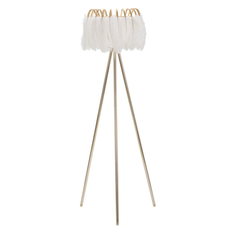 Arany fém állólámpa három rúdból és fehér tollakból álló lámpaernyőből áll. Arany fém állólámpa három rúdból és fehér tollakból álló lámpaernyőből áll.