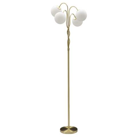 4 lámpás arany fém állólámpa átlátszatlan üveggömbökkel. Alakját kecses szövés jellemzi. Álló, asztali, fali és mennyezeti lámpák! Gömbökkel és arany bevonattal a Glamy vonal lágy és határozottan csillogó fényt kölcsönöz szobájának! 4 lámpás arany fém