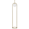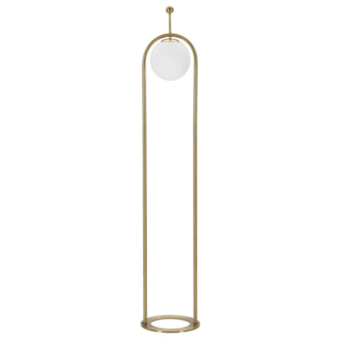 Arany fémből készült állólámpa egyszerű vonalakkal, elegáns gömblámpabúrával fehér üvegből. Arany fémből készült állólámpa egyszerű vonalakkal, elegáns gömblámpabúrával fehér üvegből.