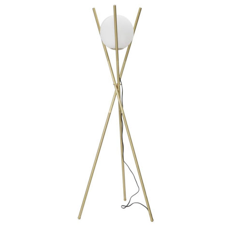 Arany fém állólámpa fehér üveggömbbel. Az alapvető és minimális vonalakat az arany eleganciájával kombinálva egyedi kombinációt alkotnak. Arany fém állólámpa fehér üveggömbbel. Az alapvető és minimális vonalakat az arany eleganciájával kombinálva egyed