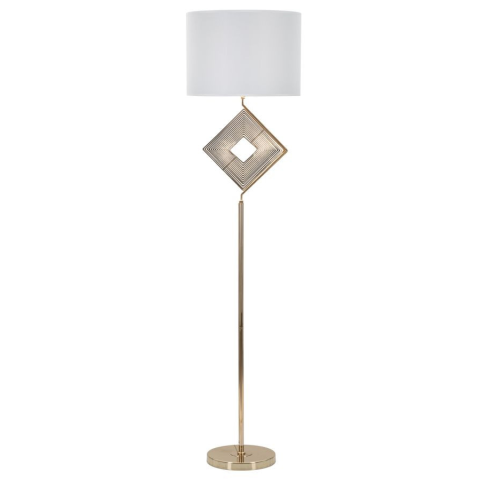 Arany fém állólámpa elegáns geometrikus díszítéssel kiegészítve fehér szövet lámpabúrával, arany széllel. Arany fém állólámpa elegáns geometrikus díszítéssel kiegészítve fehér szövet lámpabúrával, arany széllel.