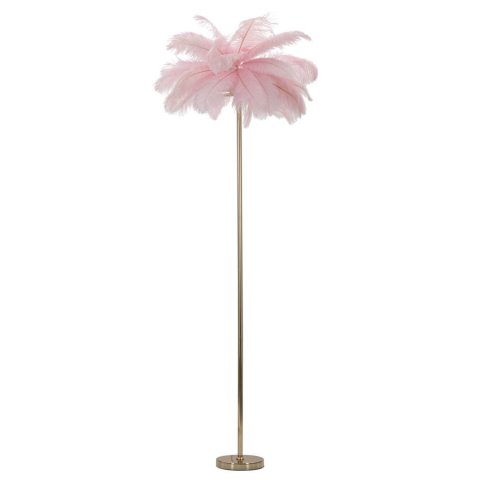 Arany fém állólámpa 3 fényponttal és rózsaszín tollból készült lámpaernyővel. Arany fém állólámpa 3 fényponttal és rózsaszín tollból készült lámpaernyővel.