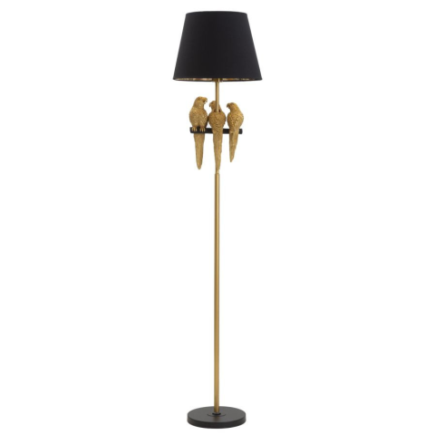 Arany fém állólámpa fekete szövet lámpabúrával. A szárat papagájok díszítik. Az arany és a fekete egyesülése tökéletes kontrasztot hoz létre, amely bármilyen helyiségbe illeszkedik. Arany fém állólámpa fekete szövet lámpabúrával. A szárat papagájok dís