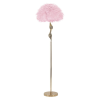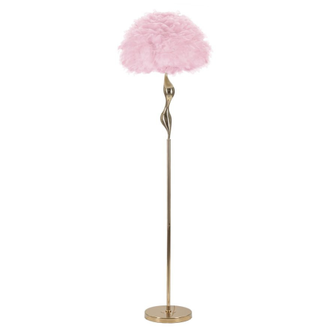 Arany fémből készült állólámpa elegáns puha és kanyargós díszítéssel kiegészítve tollból készült lámpaernyővel. Arany fémből készült állólámpa elegáns puha és kanyargós díszítéssel kiegészítve tollból készült lámpaernyővel.