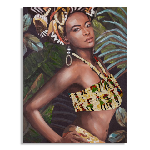 Fakerettel kiegészített vászon festmény, amely egy nőt ábrázol elegáns szövetalkalmazásokkal. Fakerettel kiegészített vászon festmény, amely egy nőt ábrázol elegáns szövetalkalmazásokkal.