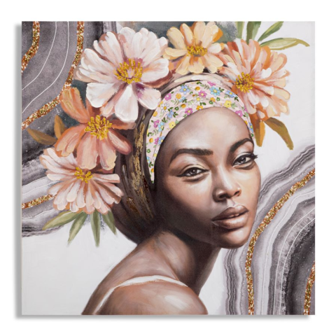 Fa kerettel kiegészített vászonfestmény, amely egy női arcot ábrázol, elegáns virágos fejdísszel, elegáns szövetfeliratokkal. Fa kerettel kiegészített vászonfestmény, amely egy női arcot ábrázol, elegáns virágos fejdísszel, elegáns szövetfeliratokkal.