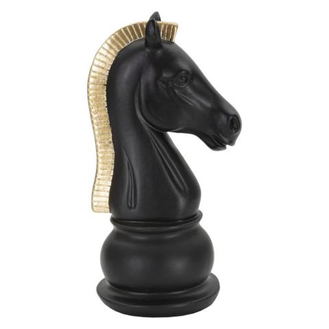 Elegáns fekete szobor, arany díszítéssel, sakkló formájú. Elegáns fekete szobor, arany díszítéssel, sakkló formájú.