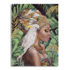 Fakerettel kiegészített vászonfestmény, amely egy nőt ábrázol papagájjal természetes környezetben. Az élénk és élénk színek és az elegáns szövetfelvitelek egy csipetnyi eleganciát adnak. Fakerettel kiegészített vászonfestmény, amely egy nőt ábrázol pap