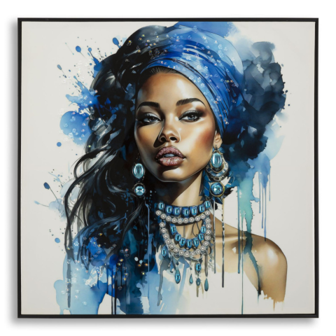 Fakerettel és fémkerettel kiegészített vászonfestmény kék turbánt és csillogó ékszereket viselő nővel, a királyság és a vibráló kultúra kifejezése. Alkalmazásokkal megkönnyebbülésben. Fakerettel és fémkerettel kiegészített vászonfestmény kék turbánt és