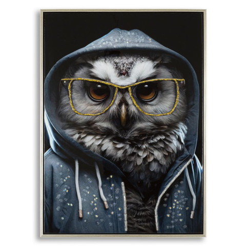 Festmény vászonra, kiegészítve fa kerettel és ezüst fémkerettel, arany szemüveges baglyokkal, miközben biztonságos és hűvös hozzáállással pózol. Alkalmazásokkal megkönnyebbülésben. Festmény vászonra, kiegészítve fa kerettel és ezüst fémkerettel, arany