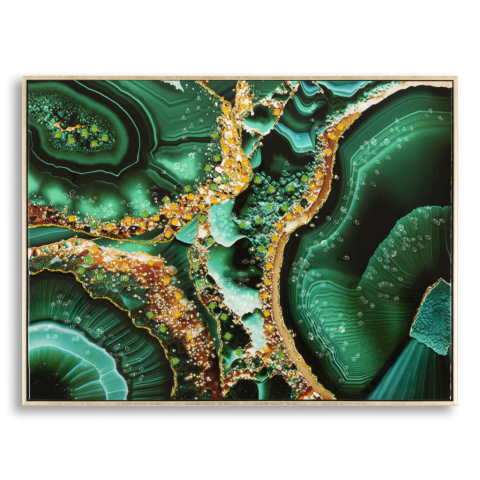 Fa kerettel és arany fémkerettel kiegészített vászon festmény, drágakőre emlékeztet, tökéletes minden környezetet természetes eleganciával gazdagítani. Alkalmazásokkal megkönnyebbülésben. Fa kerettel és arany fémkerettel kiegészített vászon festmény, d