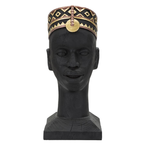 Férfifej alakú szobor az észak-afrikai hagyományok által ihletett fejdíszszel. Kidolgozása és színe az ébenfát idézi. Férfifej alakú szobor az észak-afrikai hagyományok által ihletett fejdíszszel. Kidolgozása és színe az ébenfát idézi.