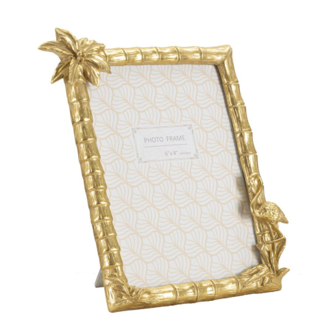 Téglalap alakú szabadon álló műgyanta keret, bambuszvesszőkre emlékeztető kialakítással, virággal és flamingóval díszítve. A fénykép mérete 15x20 cm. Téglalap alakú szabadon álló műgyanta keret, bambuszvesszőkre emlékeztető kialakítással, virággal és f