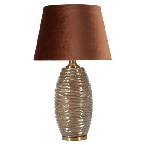 A prágai asztali lámpa kifinomult dizájnjával az eleganciát fejezi ki. A hullámos textúrával és aranyszínű részletekkel megmunkált üvegalap tökéletesen illeszkedik a barna árnyalathoz, meleg és kifinomult világítást biztosítva, amely ideális elbűvölő és h