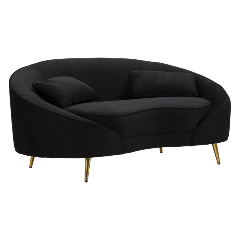 2 személyes kanapé fekete párnázott anyagból, puha és körülölelő vonalakkal, az aranyszínű fémlábak a stílust és a fényességet adják. 2 db párnával kiegészítve. 2 személyes kanapé fekete párnázott anyagból, puha és körülölelő vonalakkal, az aranyszínű
