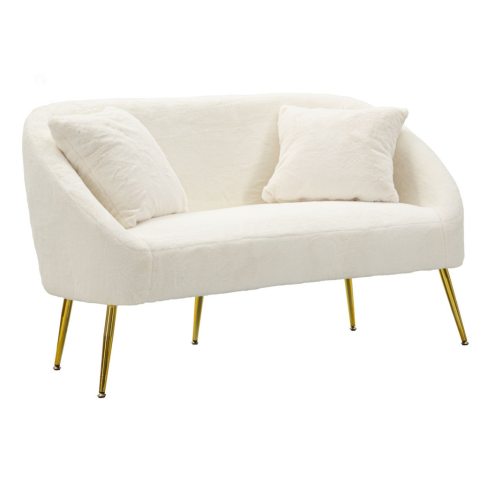 Kétüléses fehér kanapé összeszerelhető arany lábakkal, puha műszőrme borítással. Ideális a modern és kifinomult környezetekhez, egy csipetnyi luxust és kényelmet ad hozzá. Kétüléses fehér kanapé összeszerelhető arany lábakkal, puha műszőrme borítással.