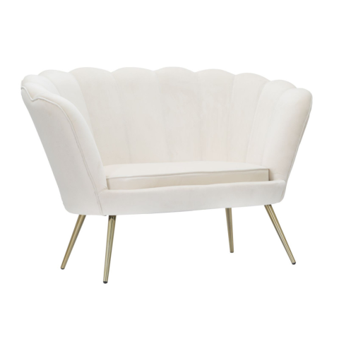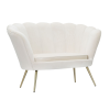 Krémszínű bársony 2 személyes kanapé arany lábakkal, különleges dizájnnal, amely egy virág szirmait idézi. A bársony és az arany fém eleganciája egyesülve egyedi stílust alkot. Krémszínű bársony 2 személyes kanapé arany lábakkal, különleges dizájnnal,