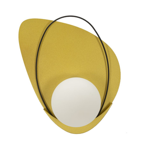 Arany fém falilámpa geometrikus formával, lekerekített sarkokkal, elegáns körkörös díszítéssel fekete fémből és lámpaernyővel matt fehér üvegből. Arany fém falilámpa geometrikus formával, lekerekített sarkokkal, elegáns körkörös díszítéssel fekete fémb
