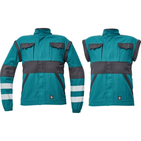MAX NEO RFLX kabát zöld 58 • férfi cipzáras munkakabát levehető újakkal • 2 első zseb • 2 mellzseb • megerősítés a váll és könyök részeken • rugalmas mandzsetta és alsó derékszegély • fényvisszavető csíkok az ujjakon és a kabát hátán, anyag: 100% pamut
