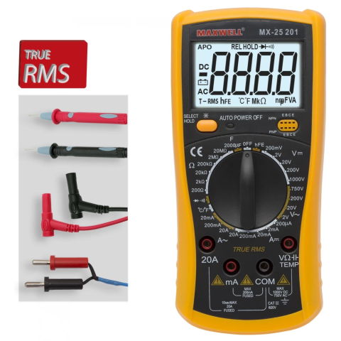 Multiméter  3 1/2 digites   DC V: 0,1µV-1000V   AC V: 1mV-750V   DC A: 100nA-20A   AC A: 10µA-20A   Ellenállás: 0,1ohm-20Mohm   Tranzisztor teszt hFE   Dióda teszt   Folytonossági teszt   Kapacitás: 1pF-20µF...