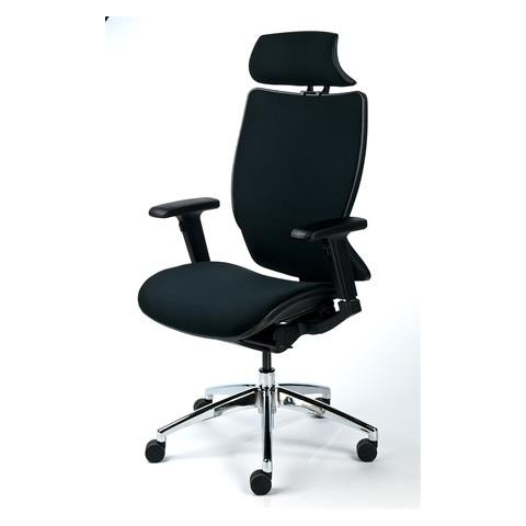 Magas háttámlás irodai szék fejtámasszal, komfortos kialakítással.