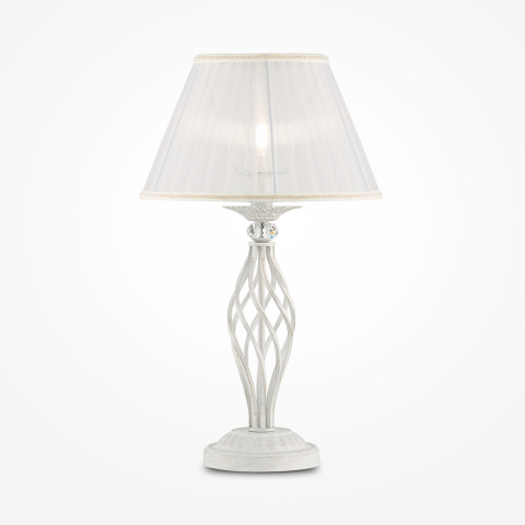 Antikolt fehér és arany színű fém vázas asztali lámpa, fehér színű organza lámpaernyővel, kristály függő dekorral. A lámpacsalád igen széles, található a modellek között többféle csillár, egyágú és kétágú falikar, asztali lámpa és állólámpa is. Mindegyik ..