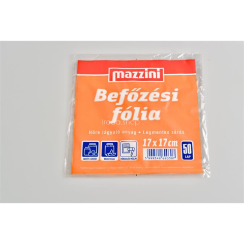 Befőzési fólia, 50 db, 17x17 cm, MAZZINI Speciális BOPP fólia, amely hőre lágyul, viszont vízzel érintkezve nem. - zárási képessége 100 °C fok körül a legjobb - előre darabolt mérete maximum 5 literes savanyúságos, lekváros, befőttes üvegek lefedésér