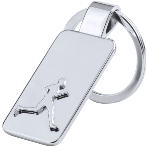 Fényes ezüst színű fém kulcstartó, futó motívummal az alján.